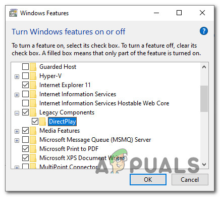 Enabling the .NET Framework 3.5 - Next, check the box associate with Legacy Components, then expand the menu and enable Direct Play as well before clicking on Ok to save the changes.