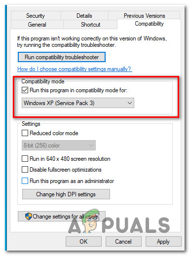 - Once you’re inside the compatibility tab, check the box associated with Run this program in compatibility mode for, then select Windows XP (Service Pack 3) from the list of available options.