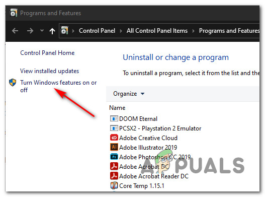 Accessing the Programs and Features screen - Once you’re inside the Programs and Features screen, click on Turn Windows features on or off from the left-hand side vertical menu.