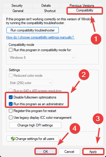 - Go to the Compatibility tab at the top. Check both Disable Full-screen Optimizations and Run this program as an administrator.