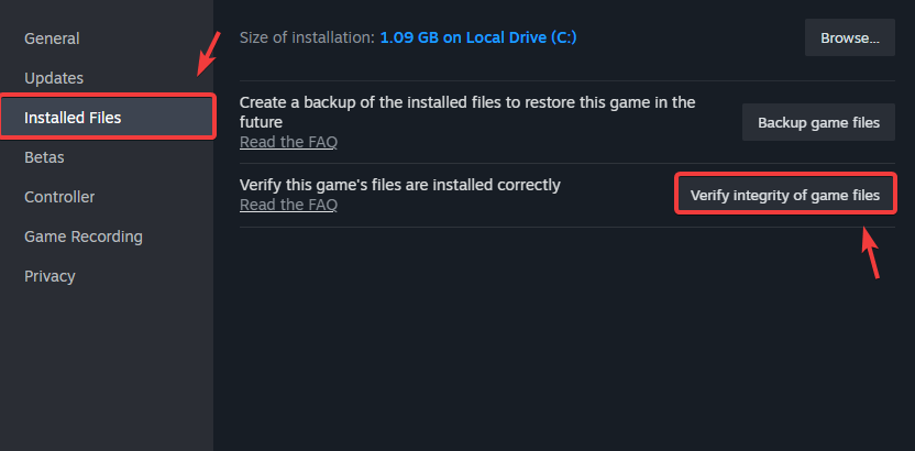 - If you’re on Steam, select Installed Files on the left and click Verify integrity of game files.