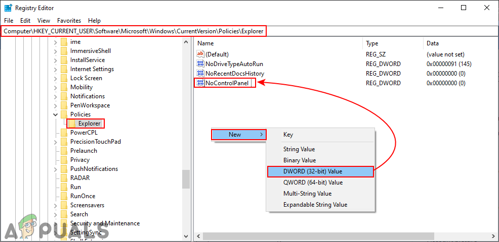 - Right-click on the right pane and choose New > DWORD (32-bit) Value. Name the new value as “NoControlPanel“.