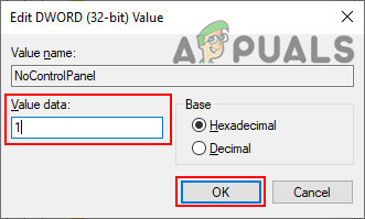 Creating a new value - Double-click on the NoControlPanel value and change the value data to 1.