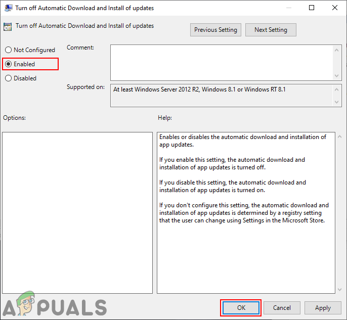 Navigating to the setting - Double-click on the setting named “Turn off Automatic Download and Install of updates“. This will open in another window, now change the toggle option to Enabled and click on the Ok/Apply button to save changes.