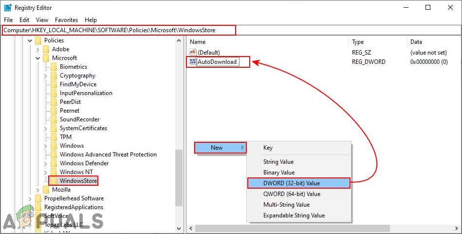 Creating the missing key - In the WIndowsStore key, right-click on the right pane and choose New > DWORD (32-bit) Value. Name this new value as “AutoDownload“.