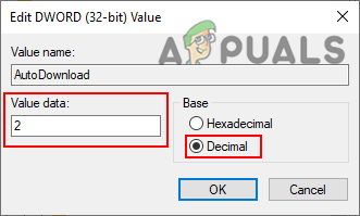 Creating a new value - Double-click on the AutoDownload value and change the value data to 2. Also, make sure to select the Base as Decimal.