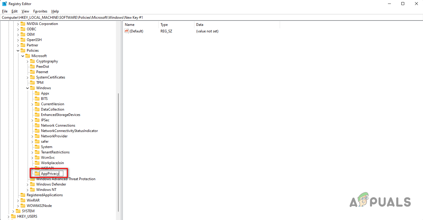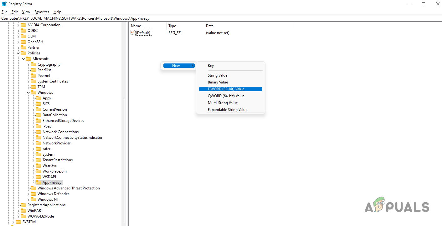HKEY_LOCAL_MACHINE\SOFTWARE\Policies\Microsoft\Windows\AppPrivacy - In case you do not see AppPrivacy under the Windows key, right click on Windows and then from the drop down menu, click New > Key.
