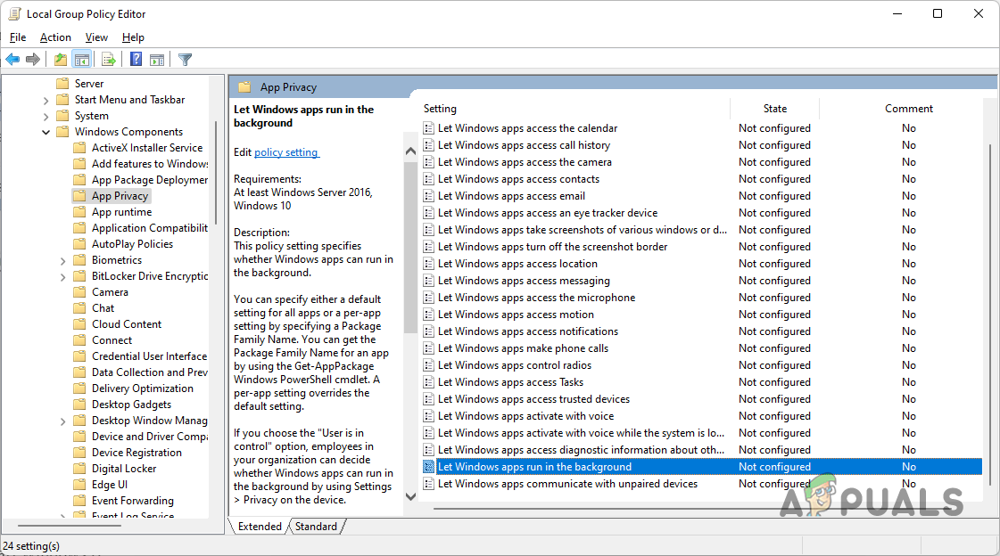 Another way you can disable background apps is through the Local Group Policy editor. These policies essentially define how your system operates and thus changing the policy for background apps will prevent them from running. To do this, follow the instructions that are given down below: