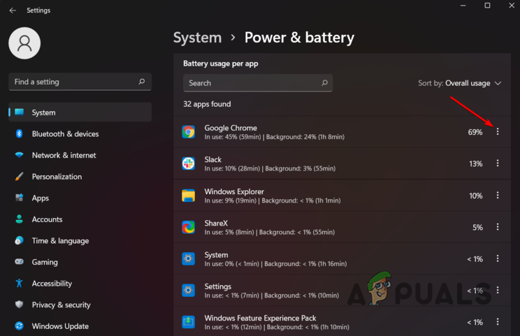 Battery Usage Per App - Click on the three dots next to the app.