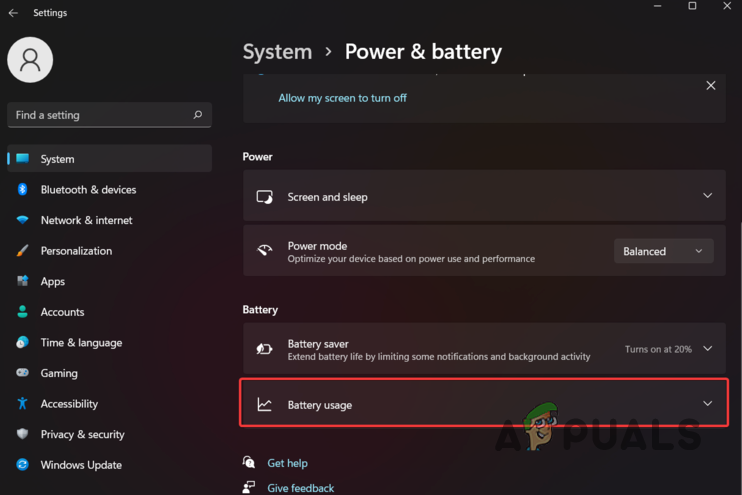 Power and Battery Settings - Then, scroll down to the bottom and then click on the Battery usage option.