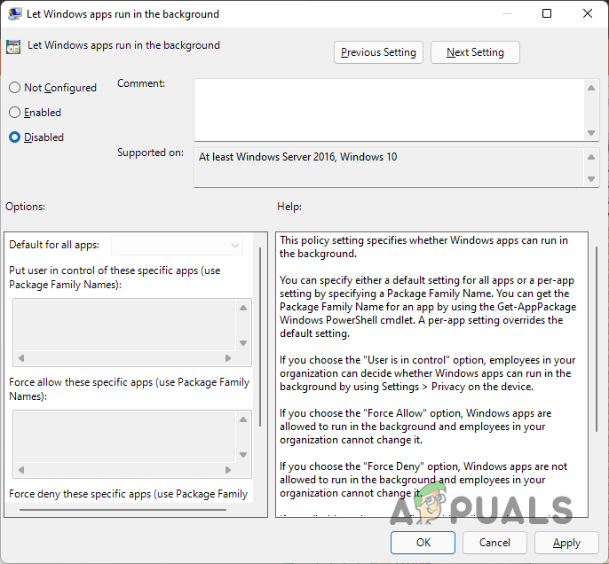 Locating Background Apps Policy - On the new window that appears, choose the Disabled option and then click Apply. Finally, hit OK.