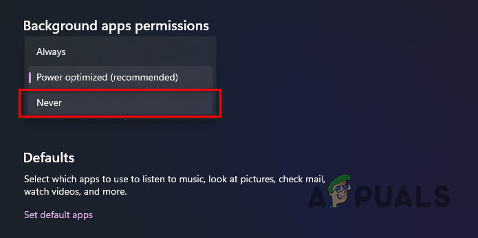 - Here, under Background apps permissions, choose the Never option.