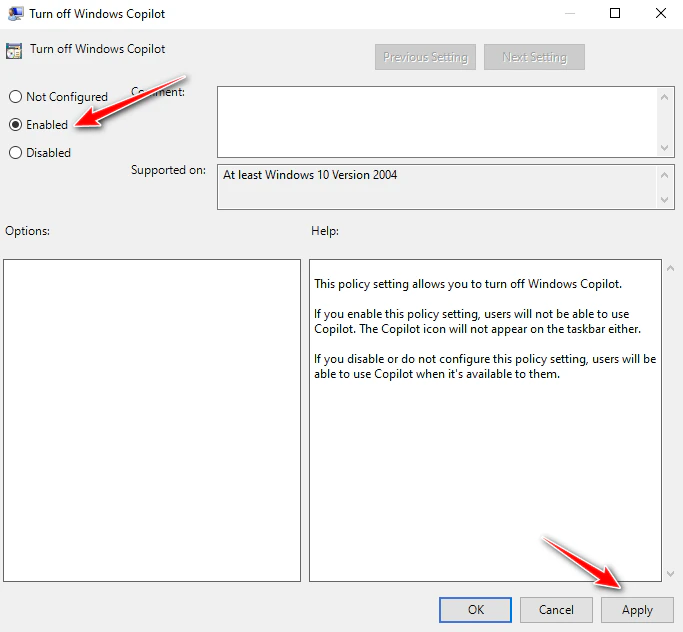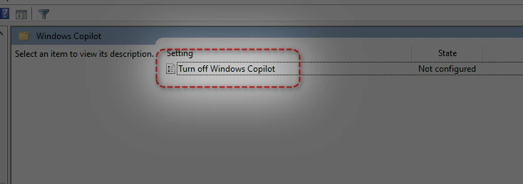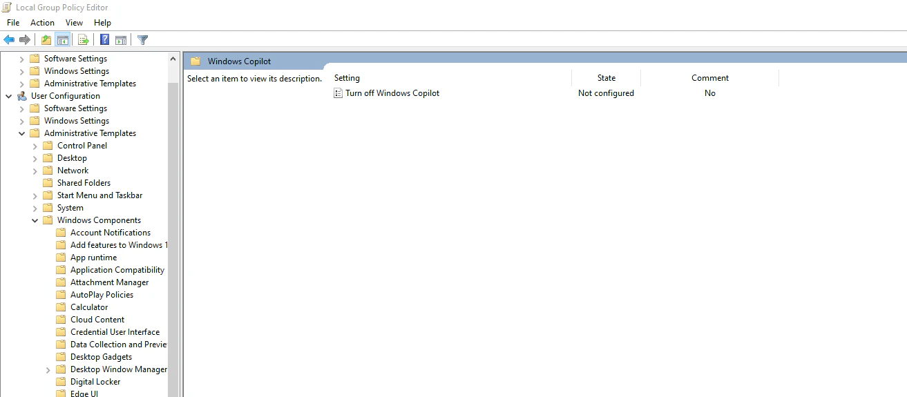 - Navigate to: User Configuration > Administrative Templates > Windows Components > Windows Copilot.
