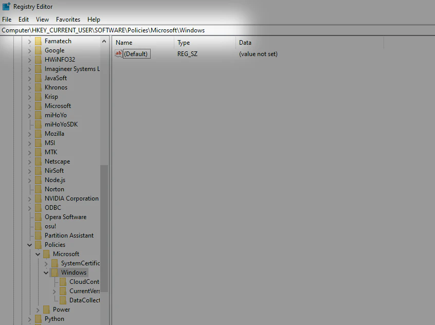 HKEY_CURRENT_USER\Software\Policies\Microsoft\Windows