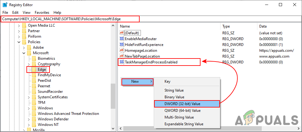 Creating the missing key - Now select the Edge key, right-click on the right pane and choose the New > DWORD (32-bit) Value option. Name the value as “TaskManagerEndProcessEnabled“.