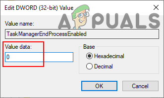 Creating a new value - Double-click on the TaskManagerEndProcessEnabled value and it will open a dialog box. Then you need to change the value data to 0 to disable the End Process button.