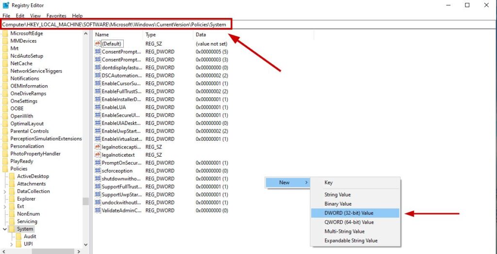 - In the left pane, go to Computer\HKEY_LOCAL_MACHINE\SOFTWARE\Microsoft\Windows\CurrentVersion\Policies\System.