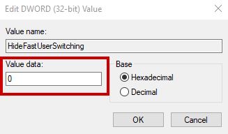 - Change the value data to 0 and restart your computer to activate Fast User switching.