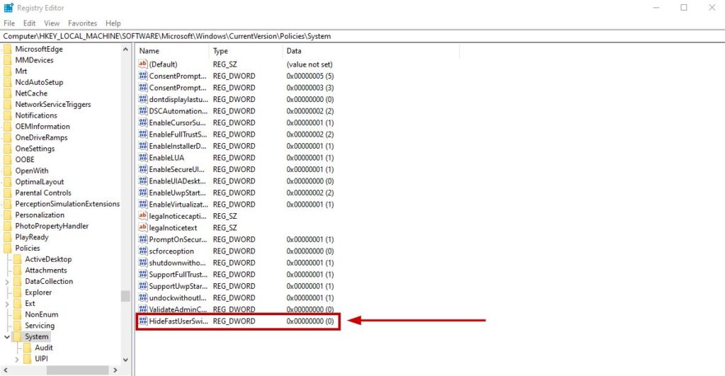 - On the right pane, double-click on a REG_DWORD value named HideFastUserSwitching.
