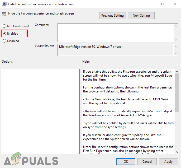 Navigating to the setting - Double-click on the setting named “Hide the First-run experience and splash screen” and it will open in another window. Now to disable the First-run experience, change the toggle option to Enabled.