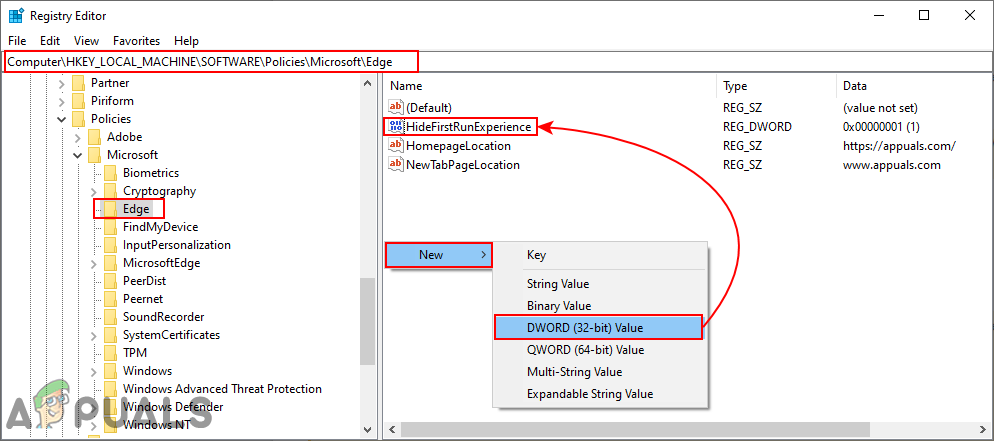 Creating the missing key - Select the Edge key, right-click on the right pane and choose the New > DWORD (32-bit) Value option. Name the value as “HideFirstRunExperience“.