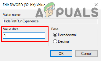 Creating a new value - Double-click on the HideFirstRunExperience value and it will open a dialog box. Now to disable the First Run Experience, change the value data to 1.