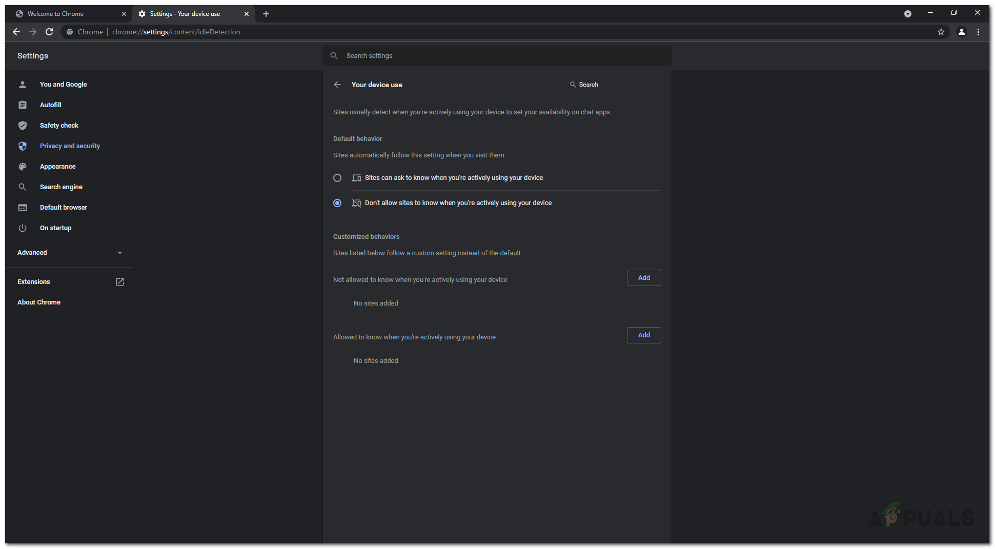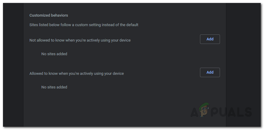 Disabling Idle Detection - In addition to that, if you wish to prevent only certain sites from tracking your device activity, you can do so by clicking the Add button next to the Not allowed to know when you’re actively using your device.