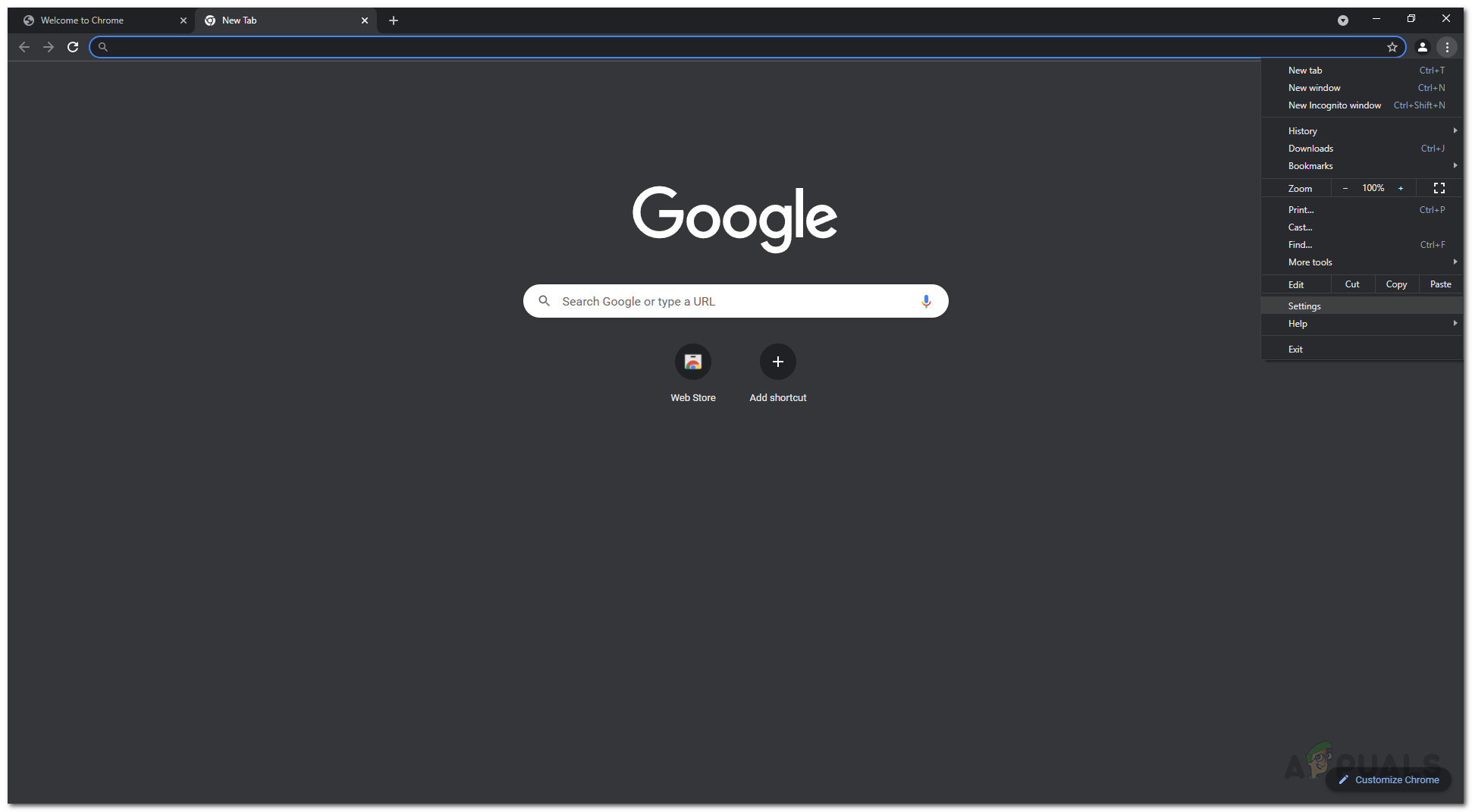 - From the drop down menu that appears, choose Settings. You can also open up the Settings window by typing chrome://settings in the address bar.