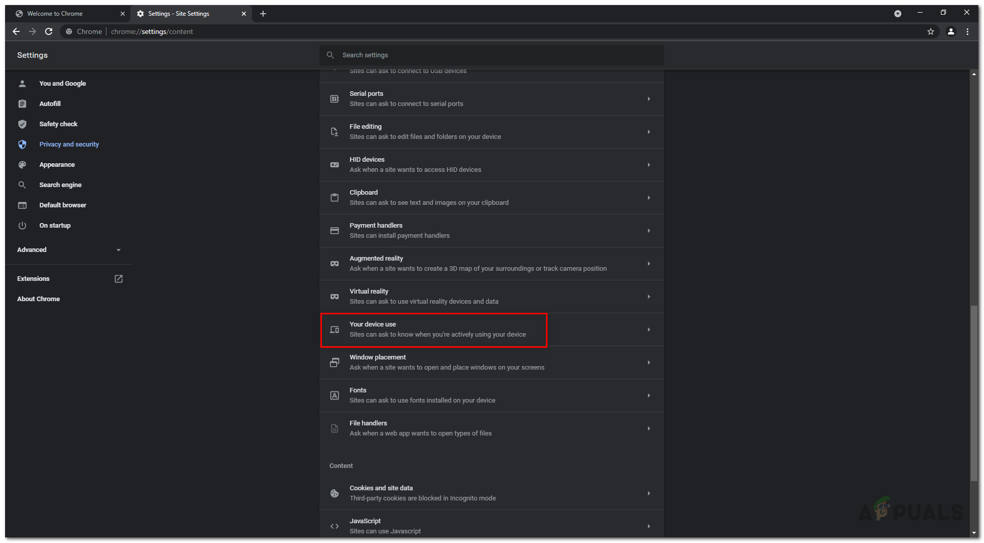 Locating Your Device Use Option - Alternatively, you could just type chrome://settings/content/idleDetection in the address bar and hit Enter to get to this page.