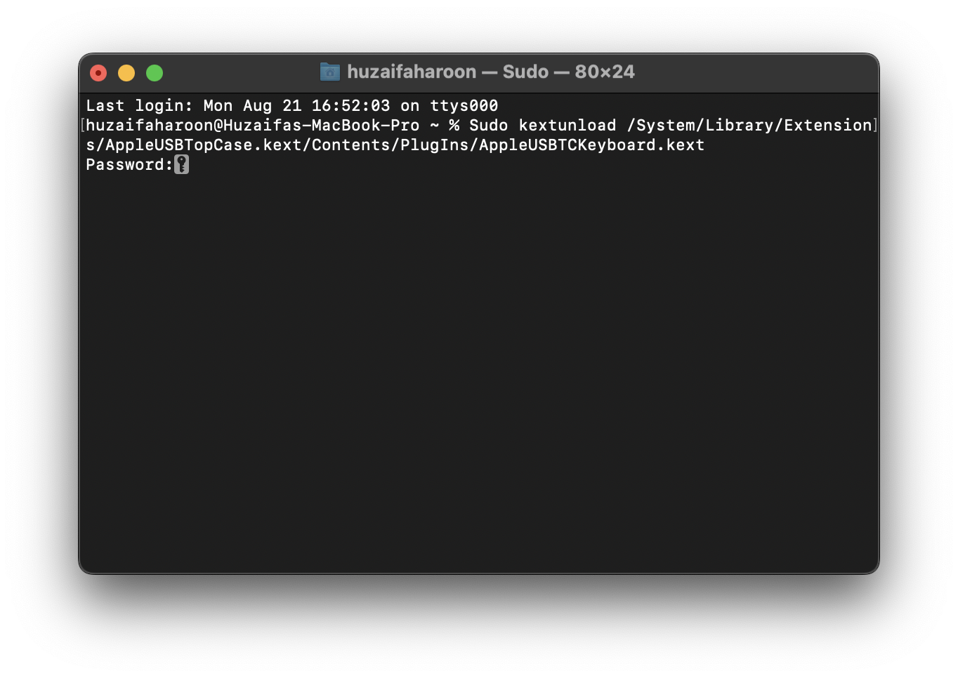 sudo kextunload /System/Library/Extensions/AppleUSBTopCase.kext/Contents/PlugIns/AppleUSBTCKeyboard.kext - Next, enter your MacBook’s password to confirm your action to disable the internal keyboard.
