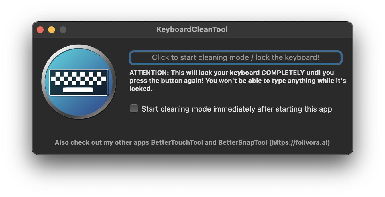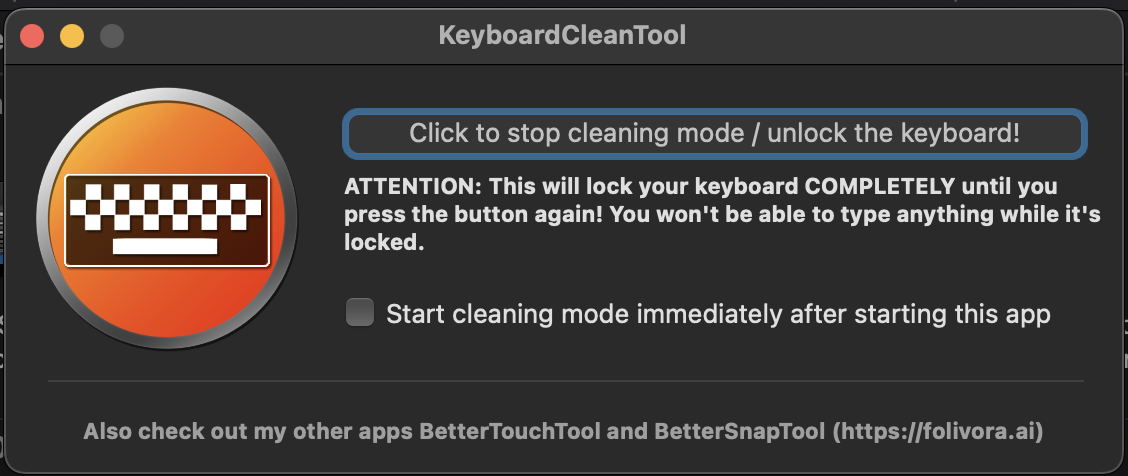 System Settings/Preferences > Privacy & Security > Accessibility > KeyboardCleanTool - Now, just open the app and click on the Click to start cleaning mode / lock the keyboard! option. You will see the keyboard icon turn orange and your keyboard will be disabled.