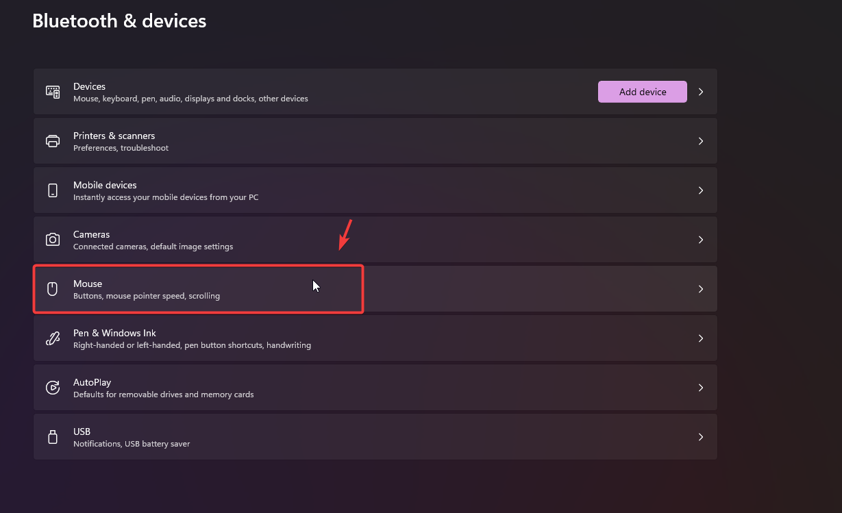 - Select Mouse from the list to view further options.