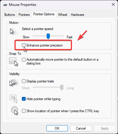 - Go to Pointer Options from the top and uncheck Enhance Pointer Precision.