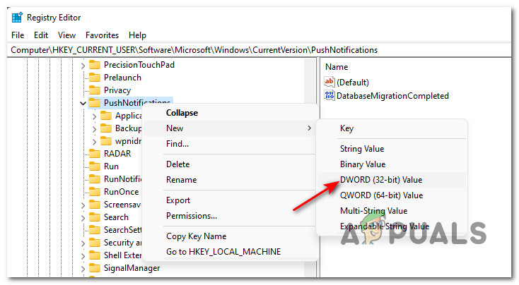 - Right-click on PushNotifications from the menu on the left and choose New > Dword (32-bit) Value from the context menu that just appeared.