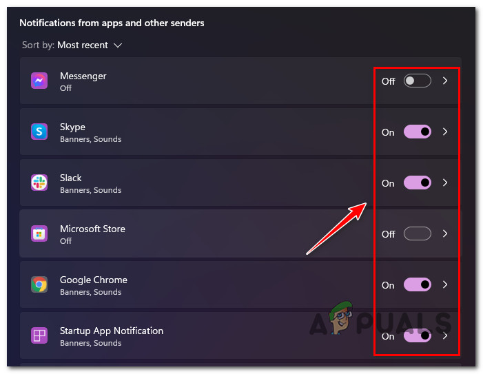 - Once you’re inside the Notifications settings page, scroll down to the Notifications from apps and other senders section and turn off or on the dedicated toggles according to which apps you want to receive notifications from.