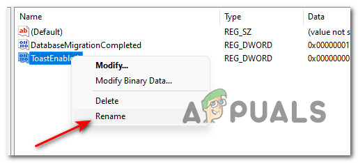 Create a new Dword - Next, move over to the right-hand pane and rename the newly created Dword to ToastEnabled by right-clicking on the item and choosing Rename.