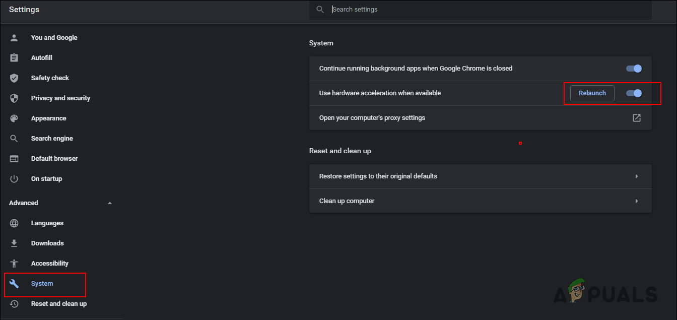 Disabling hardware acceleration in Chrome - Click on the Relaunch button to apply the new changes for hardware acceleration.