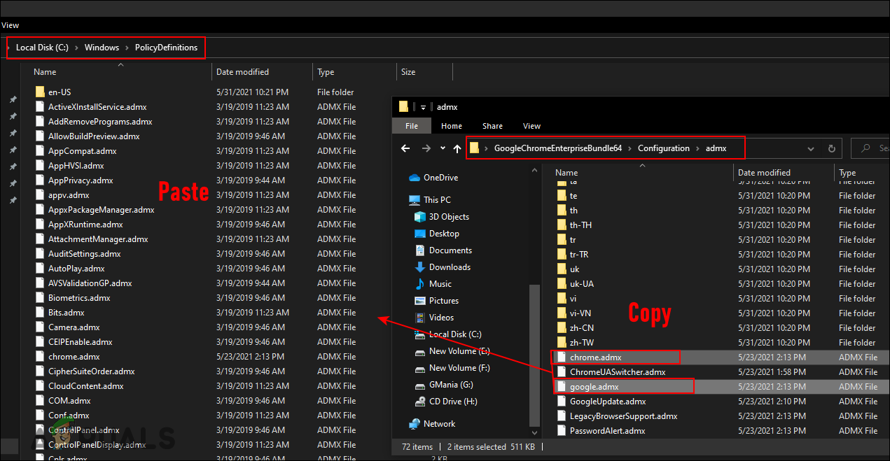 - Open the extracted folder and head over to the “GoogleChromeEnterpriseBundle64\Configuration\admx” path. You need to copy the “chrome.admx” and “google.admx” files and then paste them into “C:\Windows\PolicyDefinitions” folder.