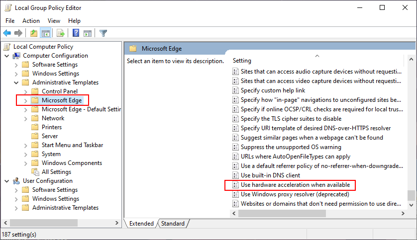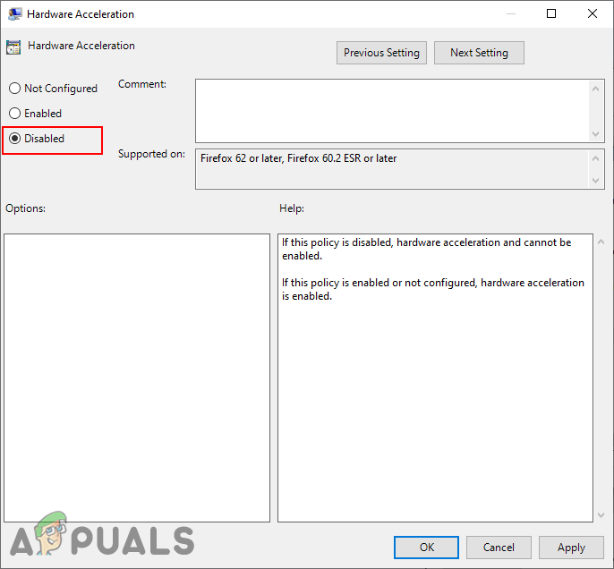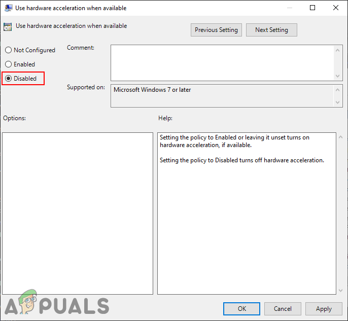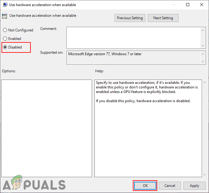 Disabling the hardware acceleration - Click on the Apply/Ok button and close the Local Group Policy Editor window.