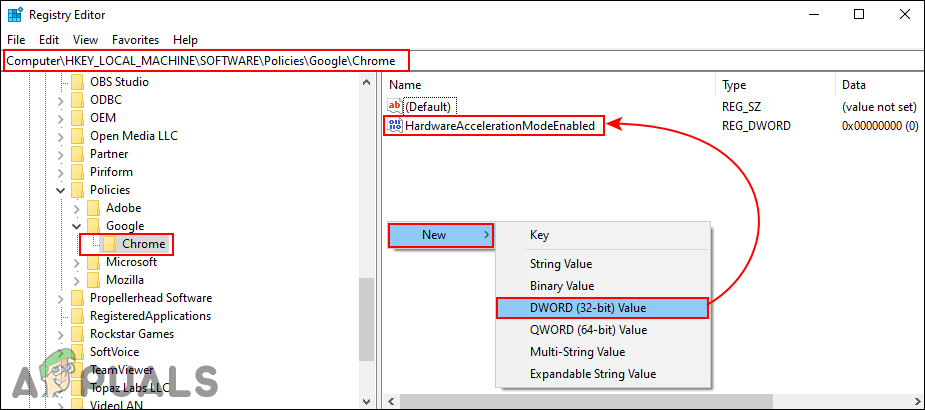 The hardware acceleration for Google Chrome can also be configured in the Registry. The Google key is located in several locations in the Registry, make sure you follow the correct path. It can also be configured for both the Local Machine and the Current User.