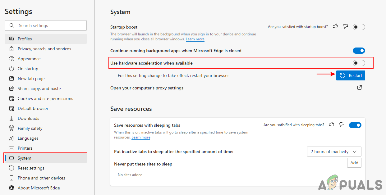Disabling the hardware acceleration - Click on the Restart button to restart the Microsoft Edge with new changes.