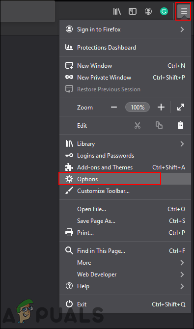 - Open your browser and click on the Application menu at the top right corner. Now choose the Options in the list.