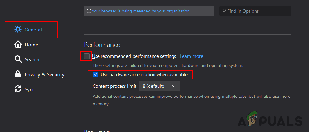 Opening Firefox settings - Select the General option in the left pane and scroll down. Uncheck the “Use recommended performance settings” under the Performance section.