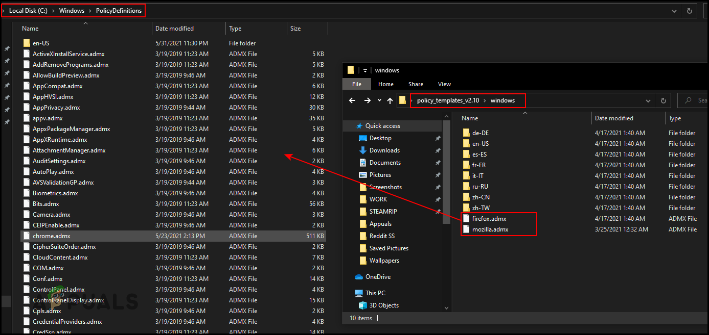 - Open the extracted folder and navigate to the “policy_templates_v2.10\windows” path. You need to copy the “firefox.admx” and “mozilla.admx” files and then paste them into “C:\Windows\PolicyDefinitions” folder.