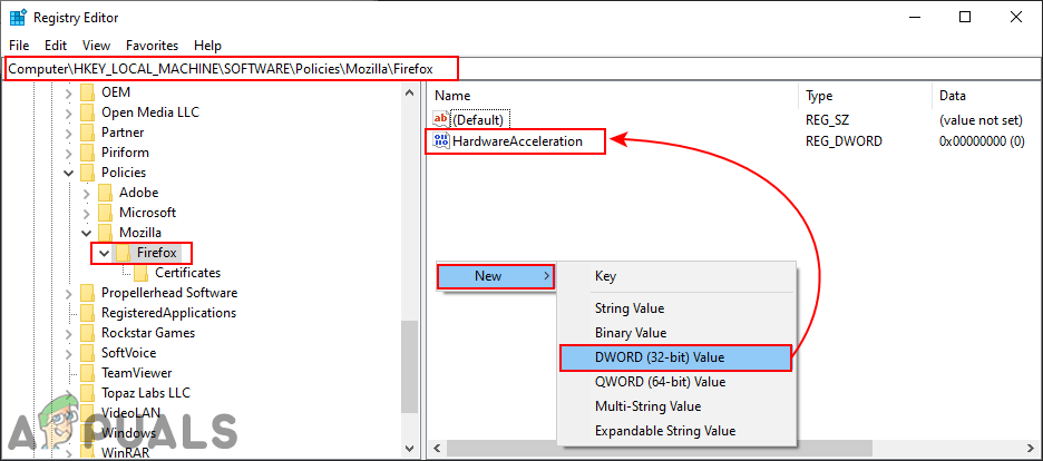 - Right-click on the right pane of the Firefox key and choose the New > DWORD (32-bit) Value option. Rename the value as “HardwareAcceleration“.