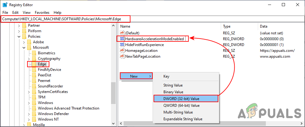 - Right-click on the right pane of the Edge key and choose the New > DWORD (32-bit) Value option. Rename the value as “HardwareAccelerationModeEnabled” and save it.