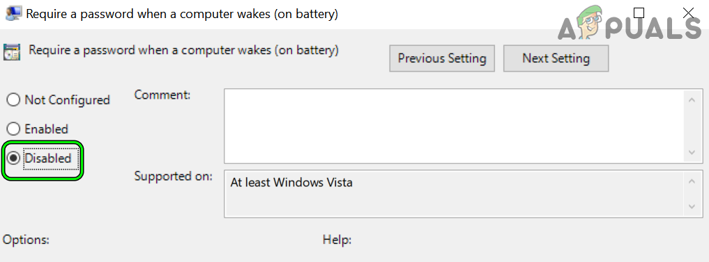 - Then, in the right pane, double-click on Require a Password When a Computer Wakes (On Battery) and select Disabled.