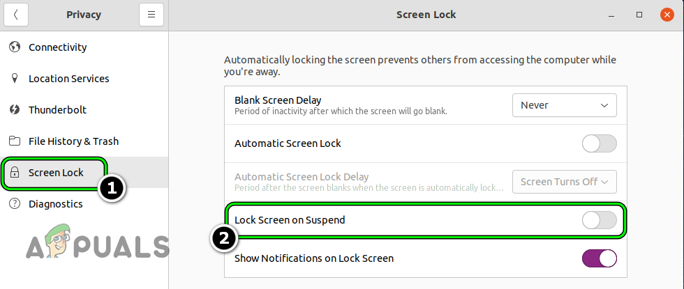 Open Privacy in the Ubuntu’s Settings - Now head to the Screen Lock tab and in the right pane, disable Lock Screen on Suspend.