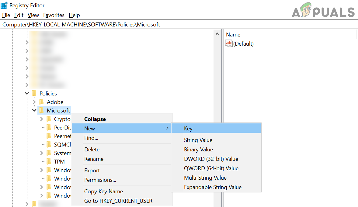 - Then, within the right pane, simply right-click on ‘Microsoft’ and select ‘New>> Key’.