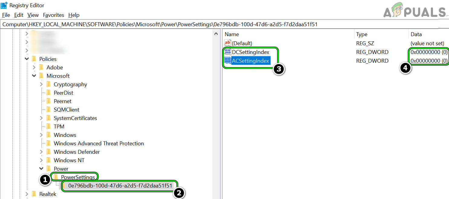 Set Value of DCSettingIndex and ACSettingIndex Value to 0 in the System’s Registry - Now close the editor and restart your PC.